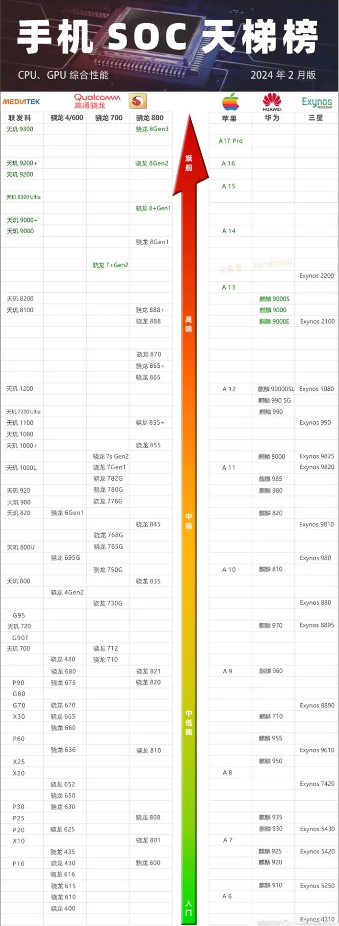 1、2024最新手机CPU性能天梯图中,可以比较不同品牌手机的CPU性能,从而更好的选择适合自己的手机。